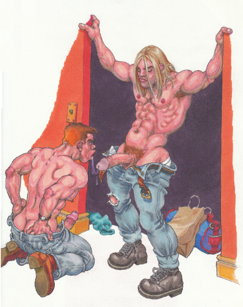 — originally published in Torso Magazine - September, 1998 issue — Just as the puck slammed into the side of my helmet, I caught a glimpse of Kevin smiling at me from the penalty box, a hank of blond hair sexily slashed across his face. My cock started to thicken as I went down, my head focused on the hot, sweat-slick blond waiting to get back on the ice. I've been on skates as long as I've been walking. We lived on a lake in the Midwest and started slapping things around on the ice as soon as it froze over. Some of my brothers were better at hockey than me, but I was fast —besides, the thick padding kept my hard cock hidden from the other guys. I couldn't help it —some got me hot because of their smiles, some because of their laughs, some just because they were, well, guys. Anyway, I got good at the game and just out of high school got signed to a minor-league team, then was traded to a more-than-minor, less-than-major-league team that was currently in a dead heat for eleventh place on the circuit we were running through a series of small Canadian cities. I was keeping my cool (and my cock in my jock) and biding my time as I honed my skills so that I would continue my climb up the trading ladder. I'm not a Gretzky, but knew that several scouts had their eye on me. Which also meant that in addition to keeping my nose clean on the ice, I had to keep my reputation clean. Let's face it —there just ain't any "out" hockey players. We'd sloughed off the bus early in the day and checked into the motel then had gone on to practice. We'd warmed up, had dinner and gone back to the arena to squeak out a win by the slightest of margins. We'd gone out to celebrate at one of the three tiny bars, the locals buying round after round for both us and the team that arrived to play the winners (us) the next night. I'd seen Kevin almost as soon as we'd come into the bar. My cock had twitched in my underwear when the blond stranger had grinned at me from across the smoky little room. I'd just assumed that he was one of the locals at this impromptu meet 'n' greet until I worked my way over to the bar and managed to sidle up next to him, my cock going hard as our legs brushed together. A big, sexy grin crossed his face. He lifted his beer glass slightly and tipped it in my direction. "Looks like we'll be crossin' sticks pretty soon." Smiling back, I tipped my glass in return, my cock throbbing as I felt him press his leg against mine. I knew it was more than hockey sticks that we'd be crossing. "I like t'get t'know th'guys I'm playin' with," Kevin slurred as he drained his glass and put it down on the bar. "These guys is gonna be here a while. Wanna come up t'th' room?" In reply, I drained my glass and slid it back across the bar and turned to follow the high, hard cheeks of Kevin's ass through the crowd, my dick all but tearing through my jeans. We crossed the deserted highway, coats bundled tight against the cold. With the fire of this unexpected (and sudden) encounter going on I could have crossed from the bar to the motel he was leading me to naked and still have been sweating bullets. Kevin fumbled with his key for a second before the door burst open with a creak and we stumbled into the dark room. He had stripped out of his coat and shrugged out of the blue plaid flannel shirt he was wearing as soon as he'd flipped on the light. As I was pulling out of my coat, the blond crossed his muscular arms across his body and skinned the thick thermal underwear shirt over his head, shaking the silky sweep of his hair back into place as he tossed the shirt onto a chair. My dick started oozing pre cum at the sight of the rippled muscles of his hard flat stomach . Absently stroking a wide hand down over his fiat gut, he glanced at the pile of bags, bottles and assorted junk guys on the move toss around night after night in hotels and motels while they 're on the circuit. I wasn't interested in another fucking thing in the room but the blond slut I was about to take up my ass. Pulling my own shirt off, I let it fall to the floor behind me as Kevin stepped forward. Reaching out, he traced a strong finger slowly back and forth across my chest from nipple to nipple. My skin pebbled with excitement as I shuddered and looked up into his face. He smoothed his strong, rough hands down over the sculpted muscles of his stomach and unbuckled his belt as he eased just the tips of his fingers down into the waistband of his tight jeans. I pressed my face forward and stroked my lips back and forth over the hard lump of his swelling cock, my hands curling around the rock-hard cheeks of his ass as he moaned and took another step forward and worked the buttons of his fly with his fingers. Pulling my hands back around his body, I helped him get his fly open and ran my hands around his narrow hips and skinned his jeans and white jockey underwear down to his knees. His long hard cock sprang up and away from his body and brushed across my cheeks and lips sexily as Kevin moaned and worked his fingers into the back of my already sweat-damp hair. I let his hard juicy cock slap back and forth across my face a few times as I worked my fingers around the base and stroked its length before closing my lips around the head. I'd wanted to slowly taste every fraction of the hard, throbbing cock, but nothing on earth could have stopped me as I swallowed the entire shaft in one gulp, pulling the thick skater's meat all of the way down my throat until his hairy balls were nuzzled up tight under my chin. He was bucking and groaning against my face with every push. Lacing his strong fingers around the back of my head, Kevin pulled my face in against the base of his cock, the slick, tight muscles of my throat massaging every inch of his cock as my fingers probed the globes of his hot fucking ass. "Suck it, man, suck it," he grunted, his hips pounding his cock all the way down my throat until my lips were ringed with his thick, blond tangle of pub