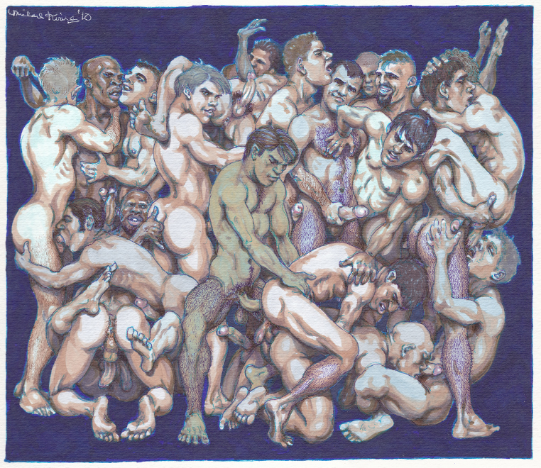 So, I wanted to create a scenario that exemplified what at least some of us cocksuckers like about our "lifestyle." I drew this piece to celebrate men who enjoy sex with each other just for its own sake and without the superficial patina of romance or some other element of a public-sanctioned proscription. "A Tightly-Knit Bunch" doesn't just refer to the guys entwined in this drawing. It also describes the spiritual connection and masculine strength "guy like us" experience when we fuck and suck and grope and grind each other because we fucking love it. I won't be marginalized by straight shitheads, and I certainly won't be marginalized by the "good homos" who champion monogamy, celebrate adopting babies and complaisantly sit in church pews while thinking they're the same as the dull, morbidly vacuous heteros. Fuck that noise!