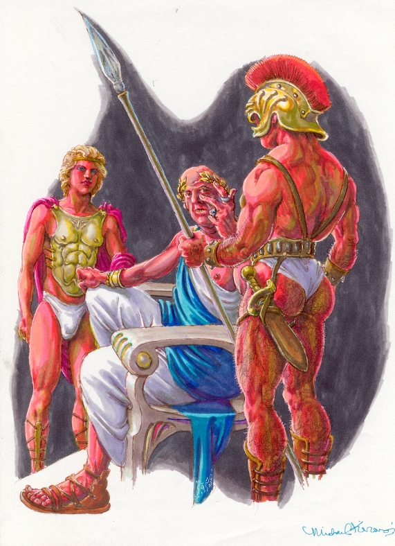 I normally avoid doing 'period' pieces. Pirates, Gladiators, Powdered Wigs. I don't really know much about them. I can research how things appeared in the past but it's impossible for me to get an authentic feel for the homo goings-on. But I saw a marble statue of a young Greek or Roman boy and wondered if I could give him an extra chapter to his life by putting him in a drawing. The Emperor's son, standing here listening to his father explain to the guard that the Emperor has political enemies who might try to harm his heir, seems comfortable with his station in life. He understands that he is part of a historical process, a dynasty, an important element in a bigger plan. He embraces his duty. That kind of thinking is very interesting to me.