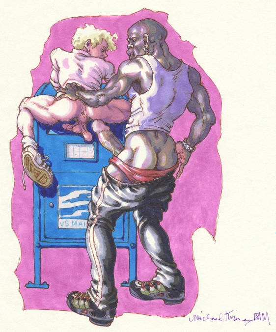 Male Slut — Mail Slot Ah! The great outdoors! It's always fun to envision how the props and structures that surround our daily lives can be utilized for sex after the lights go out. Another spot illustration that takes the two main characters (who were introduced in one of my favorite car interior scenes) to the streets where they repurpose a corner mailbox to further their mutually enjoyable antics. The blond guy was a petite 5'3" and his companion was in the 6'6" range so there was every need to find innovative methods to compensate for the height differential. And I just couldn't pass up on the "mail slot"/"male slut" pun opportunity. I'm a staunch supporter of inserting both literary and visual jokes in all erotic depictions. Just an added bonus for those who make the extra effort to discover them. — Michael Kirwan